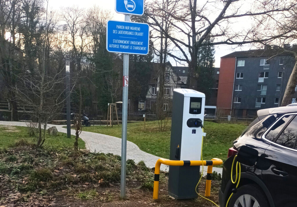 Die Parkplätze an den Ladesäulen sind für Fahrzeuge während des Ladevorgangs reserviert. Entsprechende Schilder weisen darauf hin.