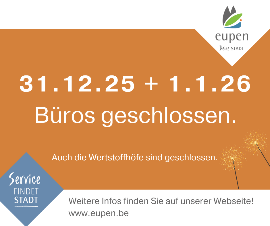 Von Mittwoch, 31.12. bis Donnerstag, 1.1. bleiben unsere Büros und Wertstoffhöfe geschlossen. Am Freitag, 2.1. sind wir wieder wie gewohnt für Sie da.